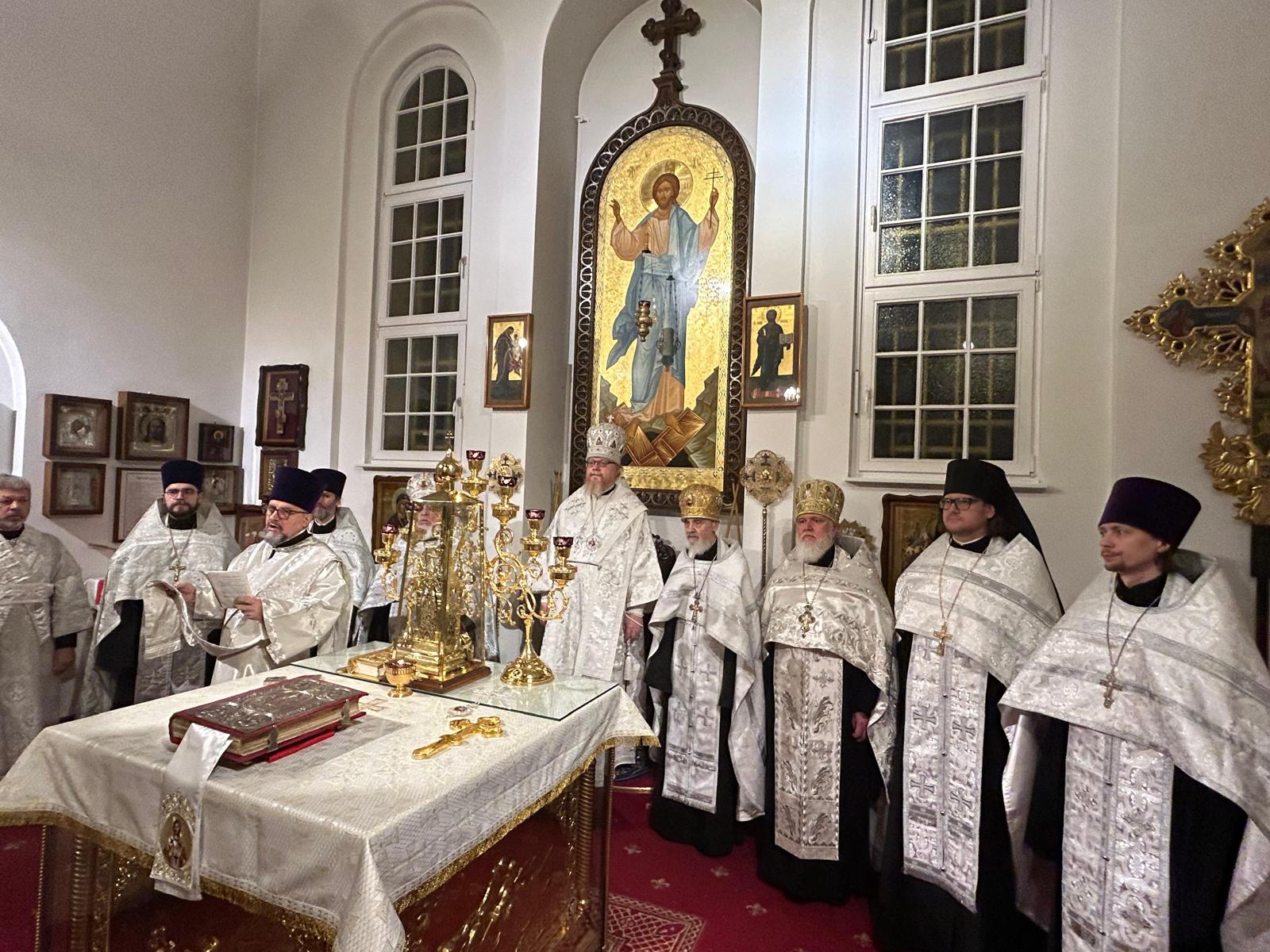 Seiner Eminenz konzelebrierten der Diözesansekretär und Dompropst Erzpriester Mikhail Diwakow, der Dekan des Dekanats Ost Erzpriester Georgy Antonyuk, Erzpriester Ilia Chirin, Priestermönch Hilarion (Reznichenko), Priester Maxim Yudakov, Priester Oleg Beltek, Erzdiakon Witalij Sadakow, Erzdiakon Archil Chkhikvadze, Diakon Mikhail Koch und Diakon Rostislav Ustimenko.