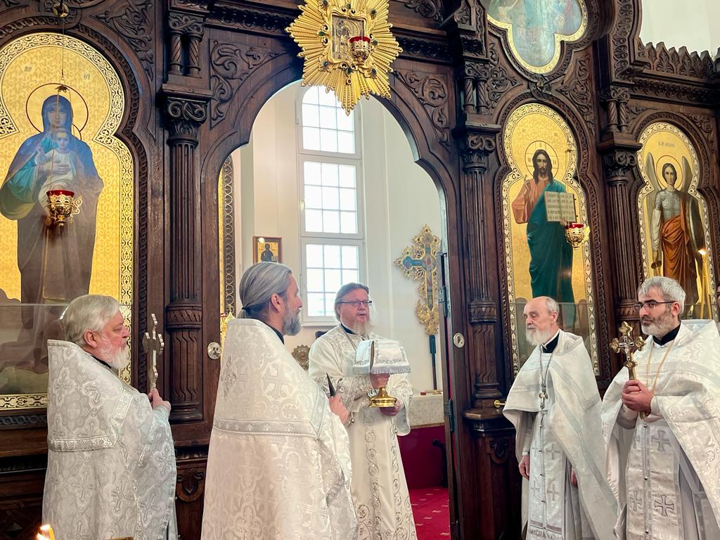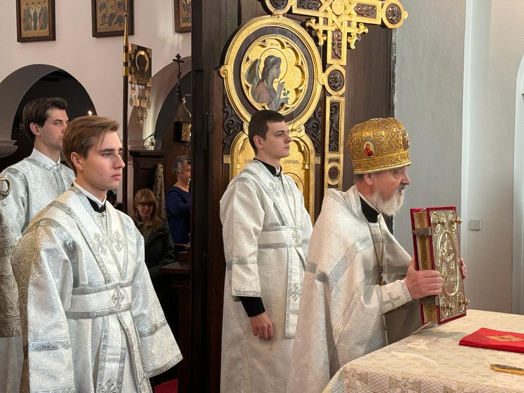 Bei der Göttlichen Liturgie konzelebrierten Seiner Eminenz: der Sekretär der Diözese und Domprobst Erzpriester Michail Divakov, der Dekan des Ostbezirks Erzpriester Georgij Antonjuk, Erzpriester Ioann Doroş, Erzpriester Ilja Čirin und Erzdiakon Vitalij Sadakov.