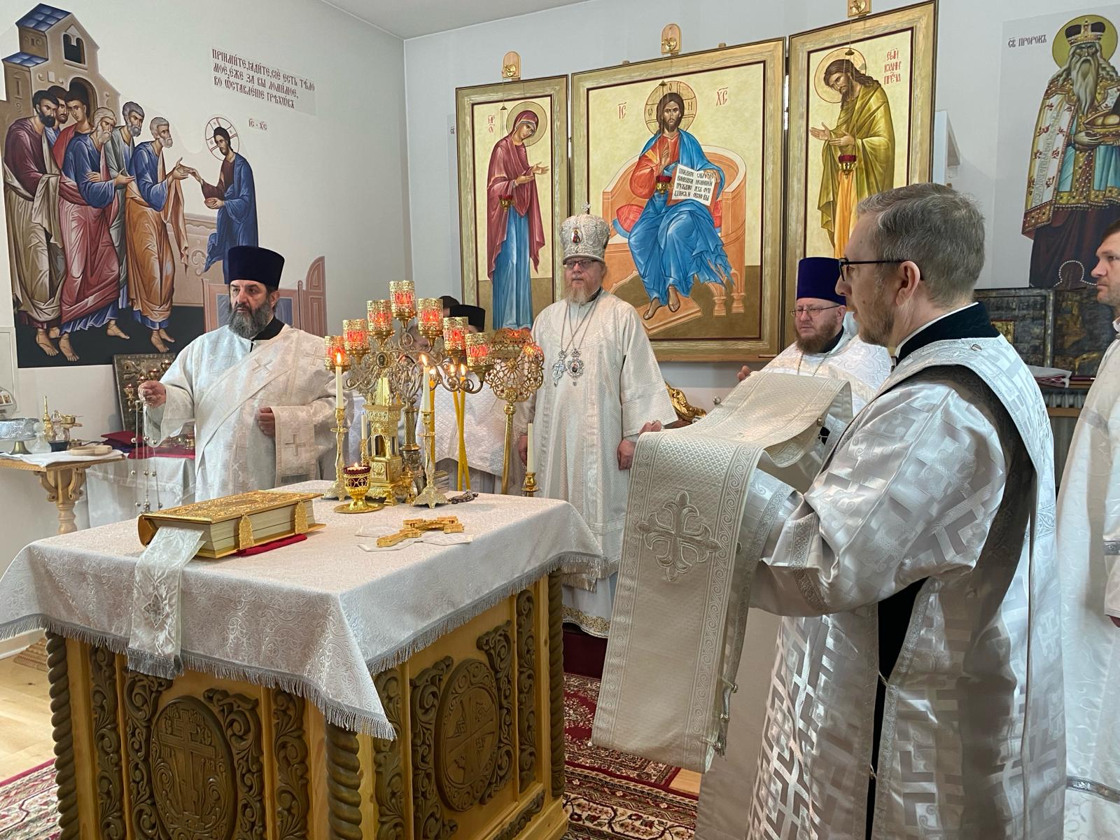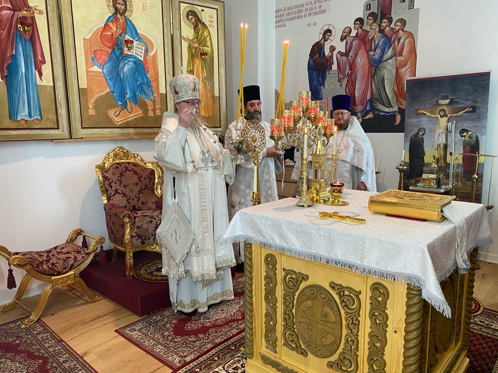 Seiner Eminenz konzelebrierten Erzpriester Aleksij Rybakov, der Vorsteher der Gemeinde, Priester Dimitru Kozachiuc, der Vorsteher der Gemeinde Kosmas und Damian in Gummnersbach (Rumänische Orthodoxe Kirche), Protodiakon Archil Chkhikvadze und Diakon Sergij Ivanov.