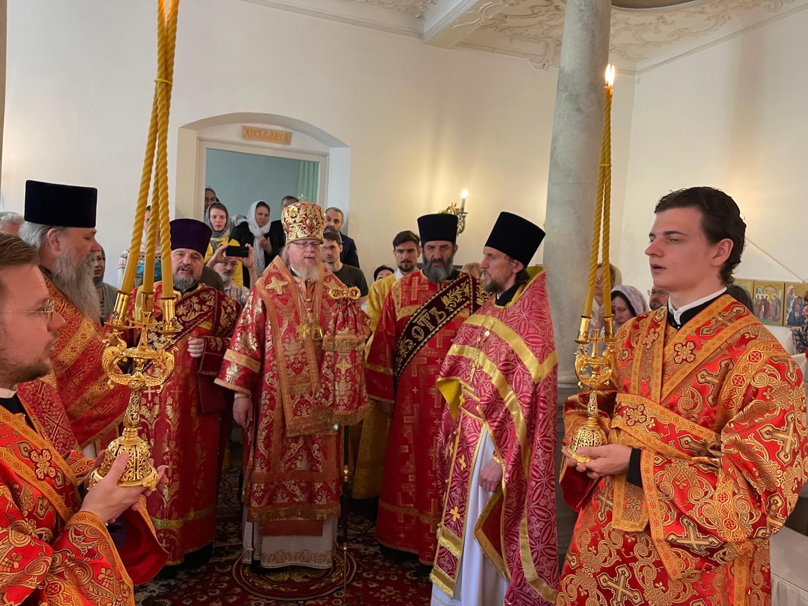 Zum Abschluss der Göttlichen Liturgie sang Erzbischof Tichon zusammen mit dem Klerus die Osternstichera. Anschließend richtete Seine Eminenz ein pastorales Wort an die Teilnehmer des Gottesdienstes. Priester Konstantin dankte dem Diözesanbischof für seinen Besuch der Gemeinde.