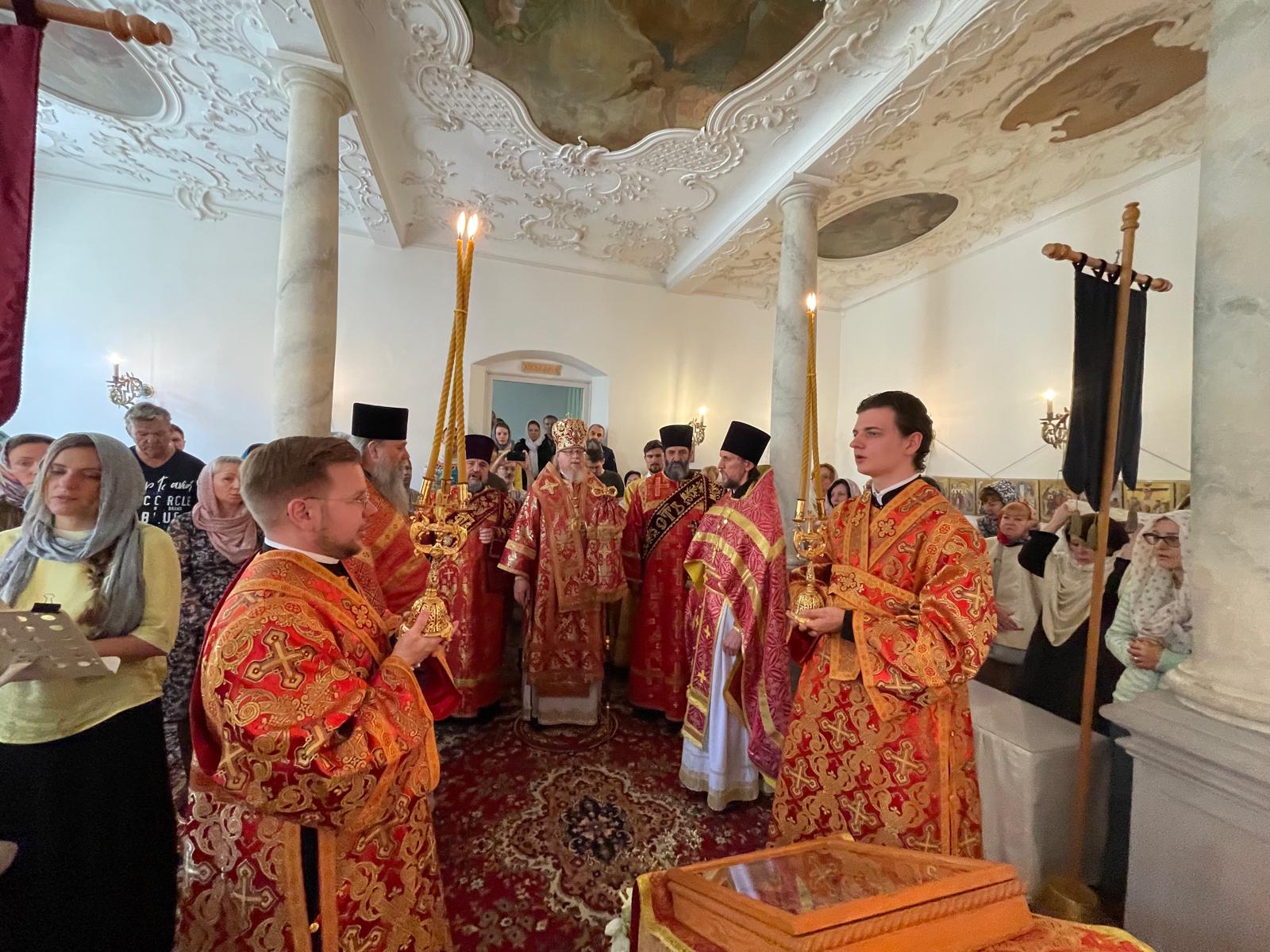 Seiner Eminenz konzelebrierten der amtierende Dekan des Dekanats Süd Erzpriester Michael Dronow, der Gemeindepfarrer Konstantin Schmidt, Erzdiakon Witalij Sadakov und Erzdiakon Archil Chkhikvadze.