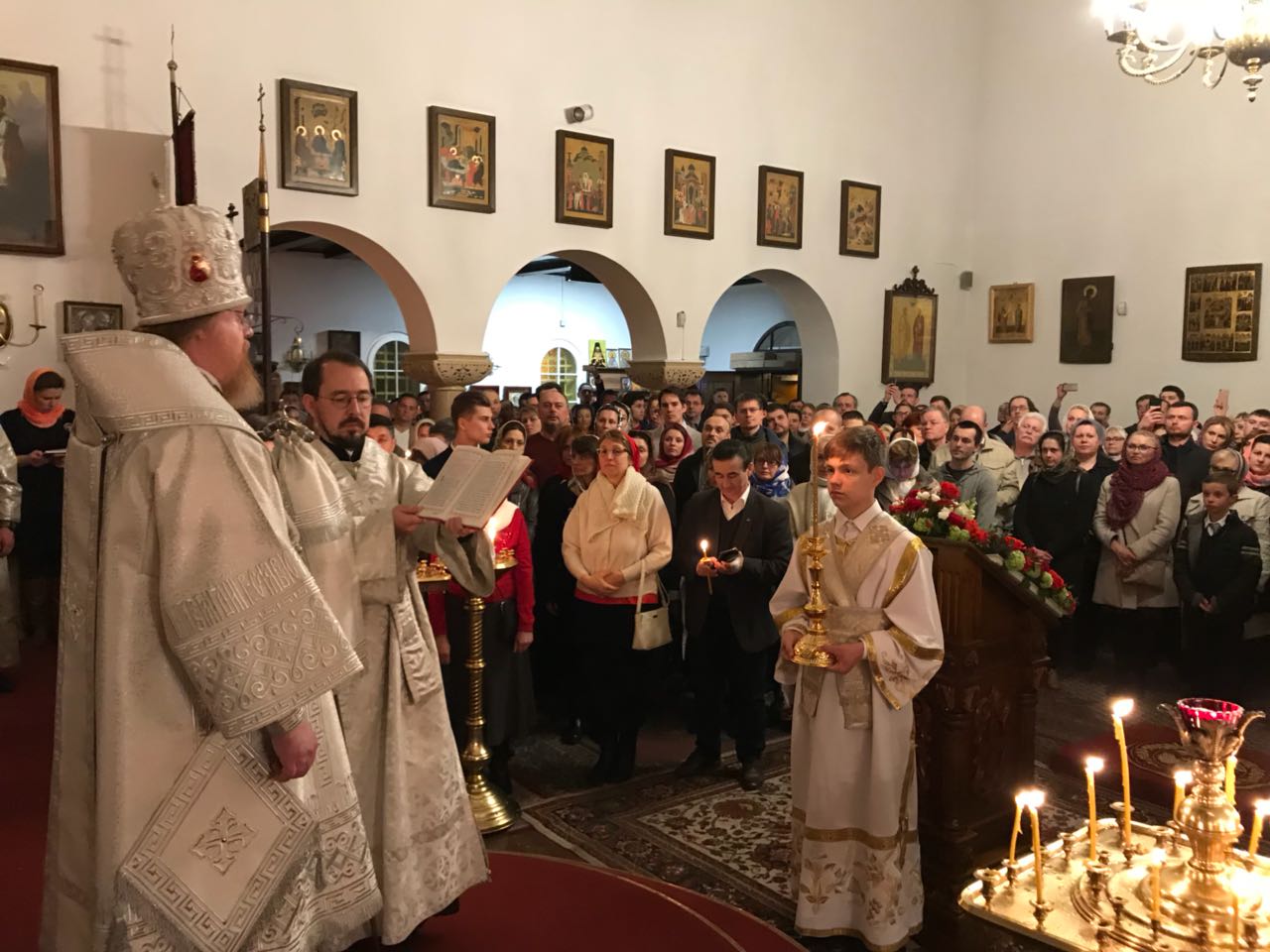 В ночь с 7 на 8 апреля 2018 года архиепископ Подольский Тихон, управляющий Берлинско-Германской епархией, совершил Пасхальные богослужения — полунощницу, крестный ход, Пасхальную заутреню и Божественную литургию свт. Иоанна Златоуста в Воскресенском кафедральном соборе г. Берлина.