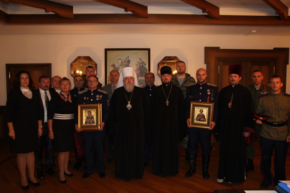 Члены делегации посетили штаб казачьей станицы, Владыка Кирилл вручил молитвословы православного казака и иконы для храма и казачьей станицы, а также методические материалы, подготовленные сотрудниками Синодального комитета.
